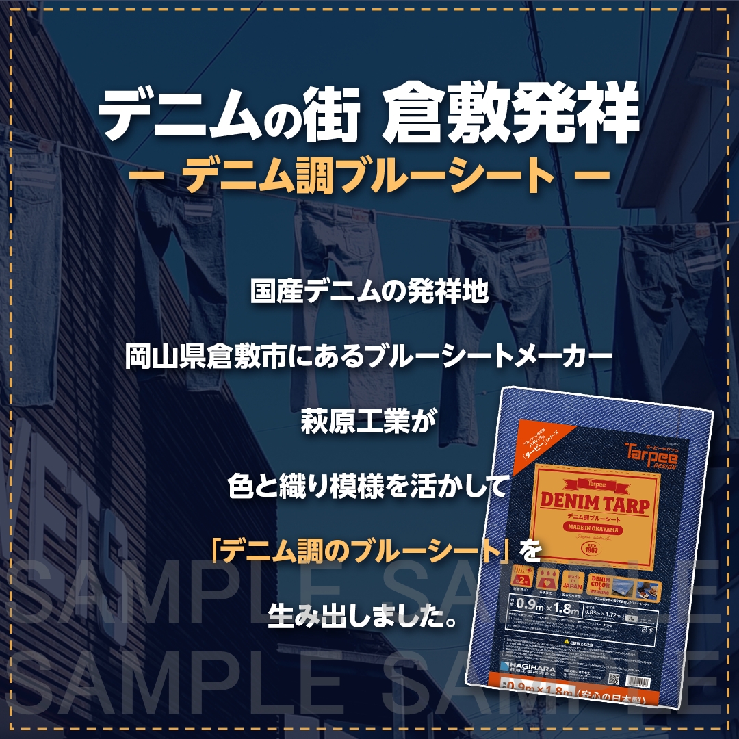 ブルーシート国内産トップシェアのノウハウで出来た、色と織りで表現するデニム調のブルーシート。「防水性」「丈夫さ」といったブルーシートの特性を持ちながら、見た目はフェイクとは思えないデニムそのもの。