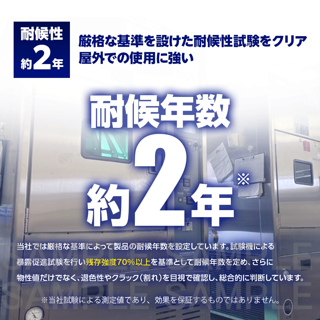 昨今の防災減災シーンに合わせて従来品の2倍となる約2年相当の耐候性を保有。再生原料を60%以上使用したエコマーク取得品です。また短辺へのロゴマーク刻印でスムーズな施工を叶えます。