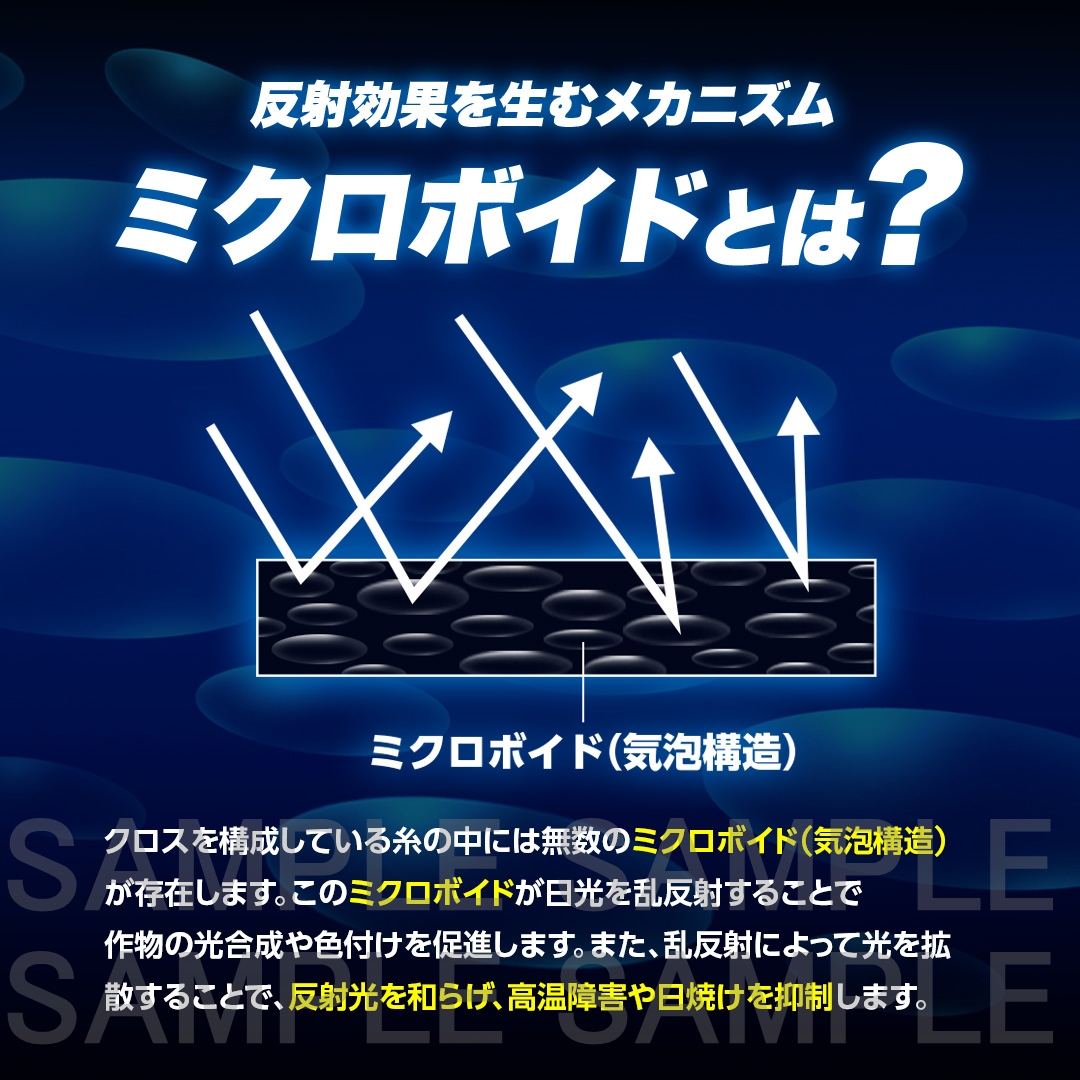 気泡構造のミクロボイド(微細孔)による乱反射なので、ムラの少ない反射効果を発揮。直反射光に比べて光が柔らかく、強光による日焼けが起こりにくくなります。