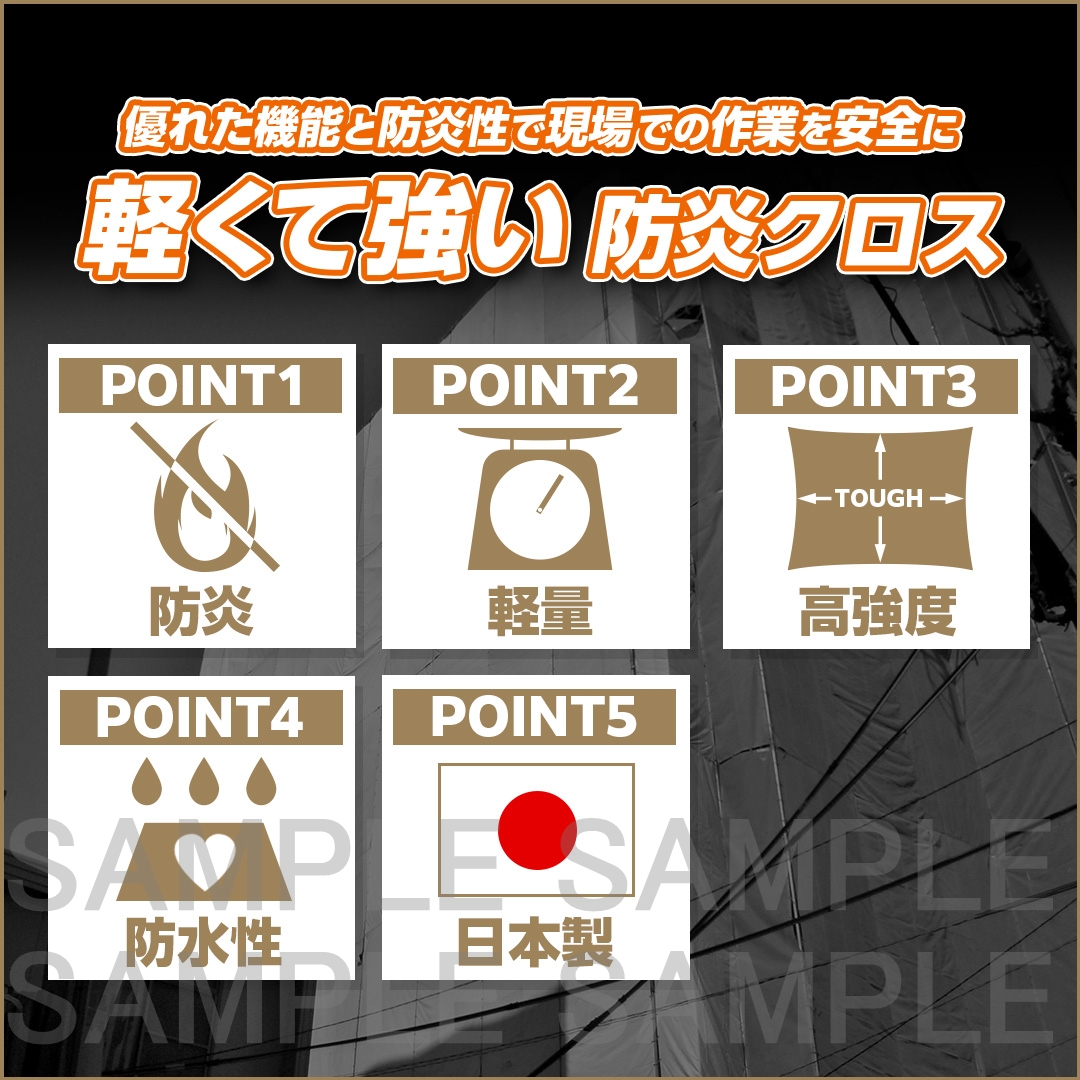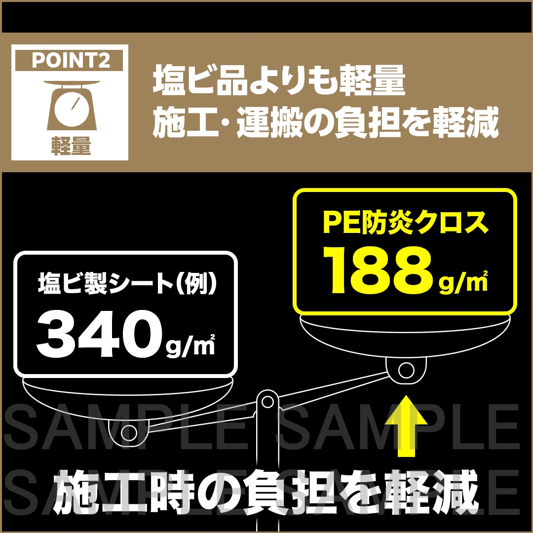 塩ビ品に比べて軽量で、強度に優れた防炎クロス