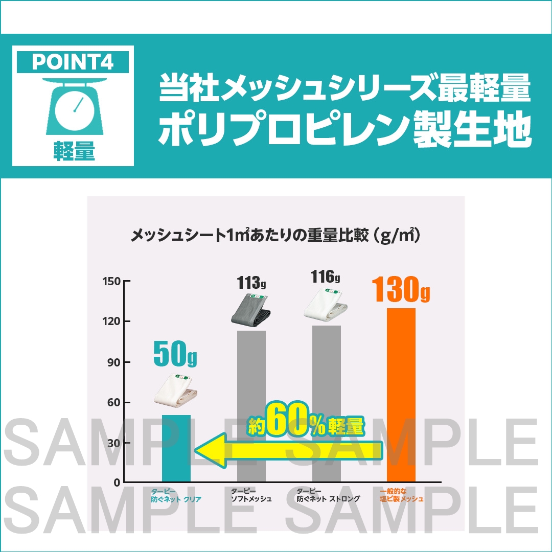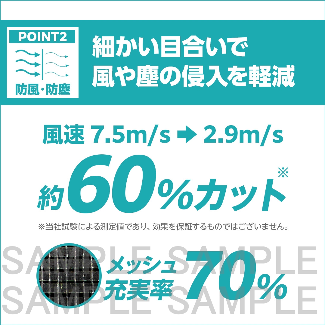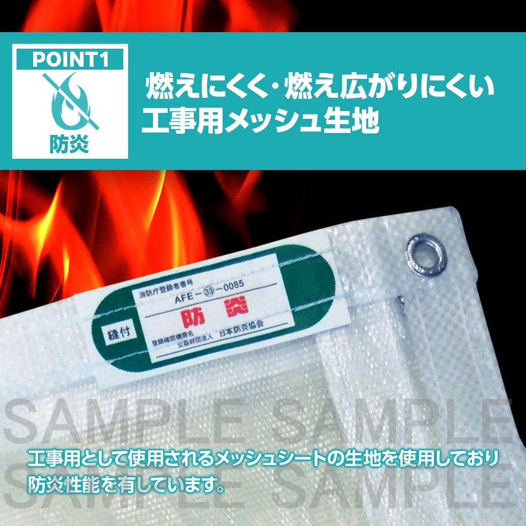 風・砂・塵・雪・鳥・虫などのバリアに最適なメッシュシートです。半透明で視界を良好に保ち、死角を作らないので防犯にも有効です。軽量で作業性にも優れています。防炎機能を備えており、消防法に定められた防炎性能基準を満たしています。