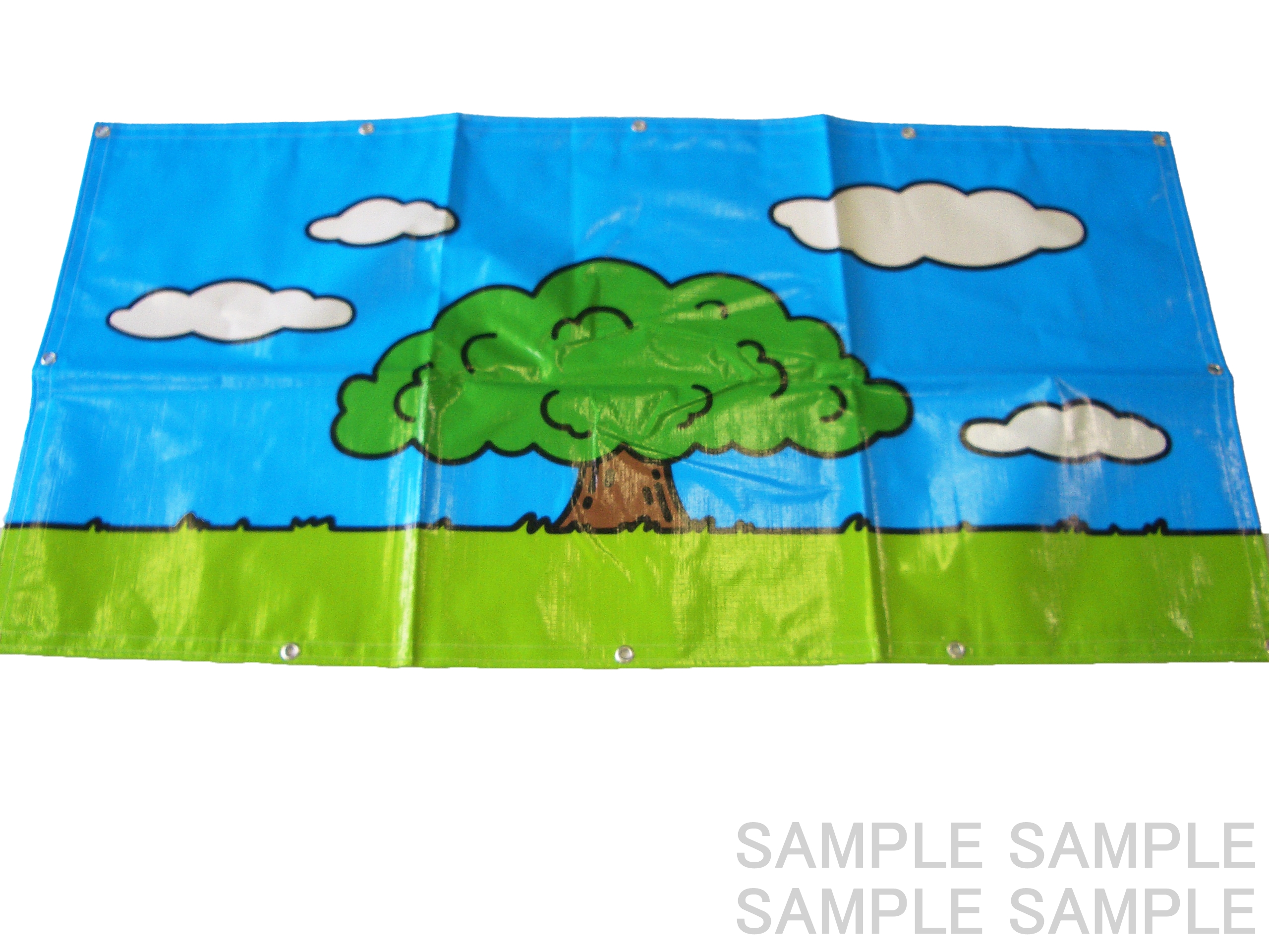 シート本体:ポリエチレン、ハトメ:アルミニウム(刻印有り)、周囲ロープ:ポリプロピレン