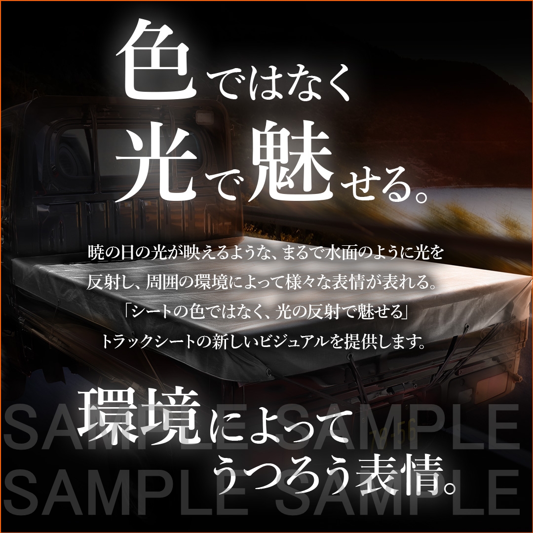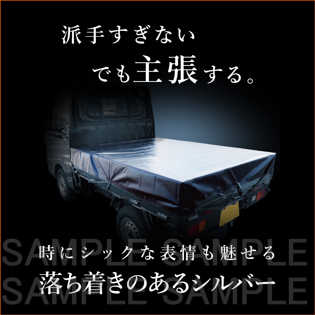 光で表情が変わるメタリックシルバーカラーを採用。約5年の耐候性を持つ軽トラックシートです。
